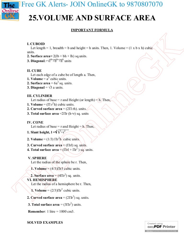 Surface area to volume ratio. Find the surface area of solids (worksheets and solutions). Surface area formulas
